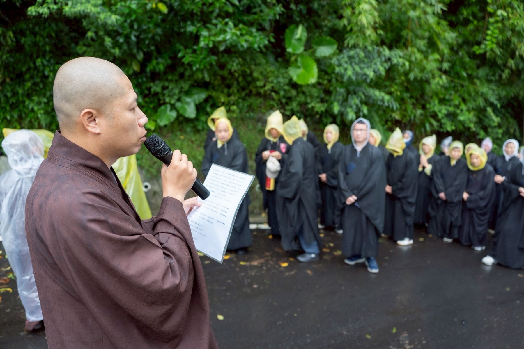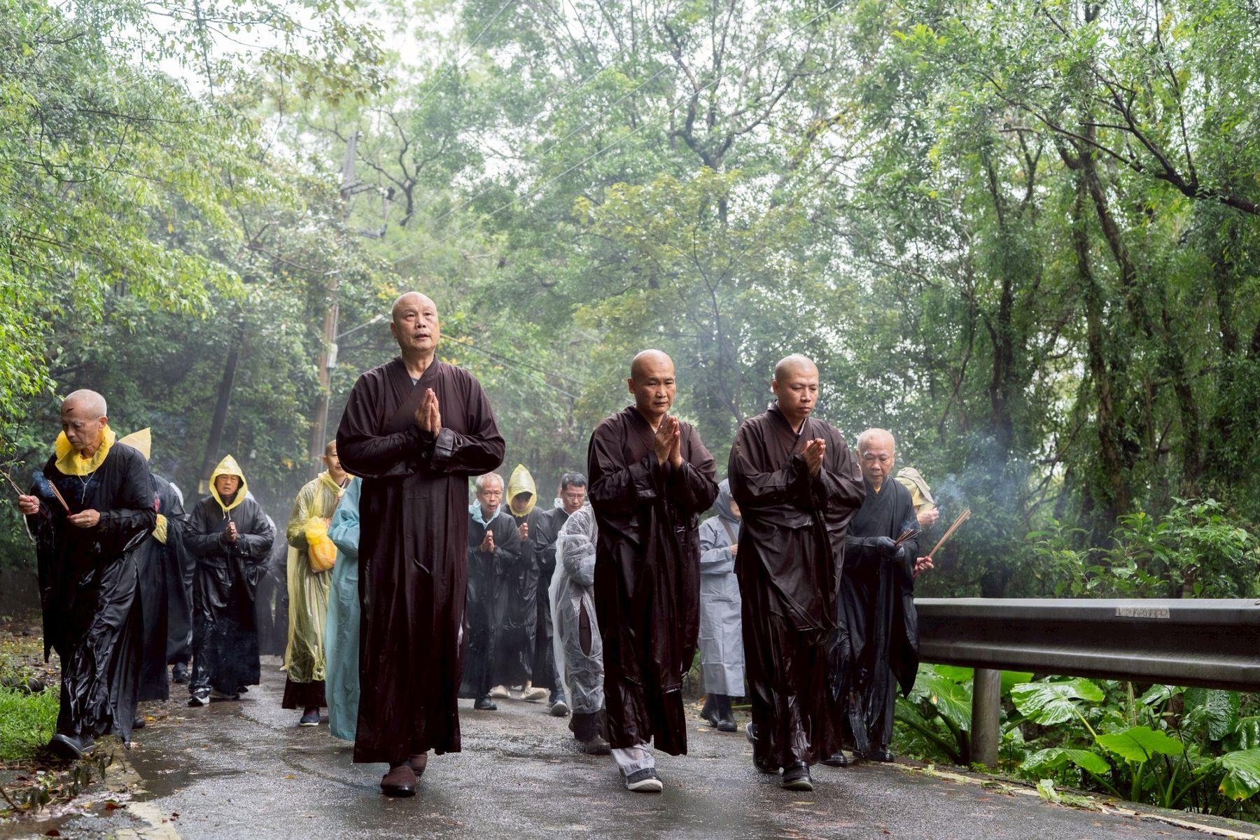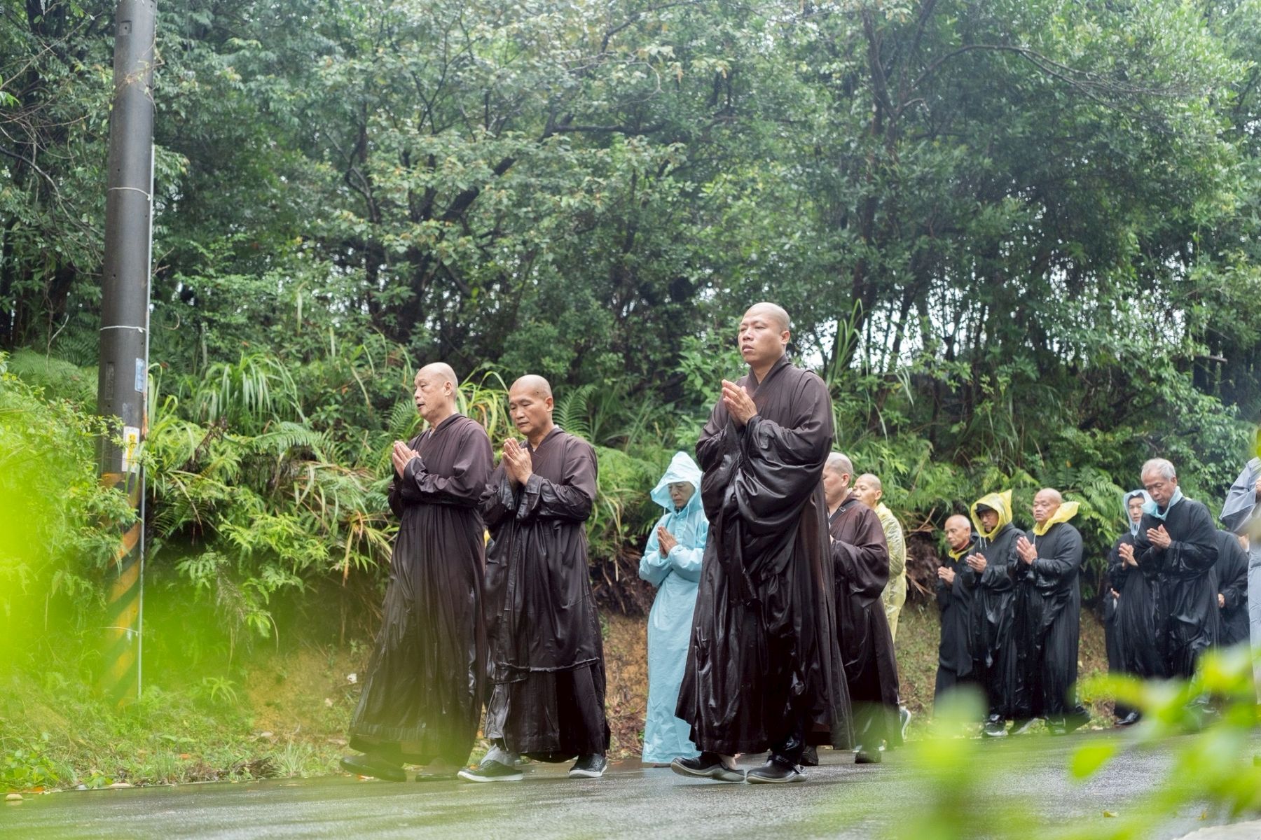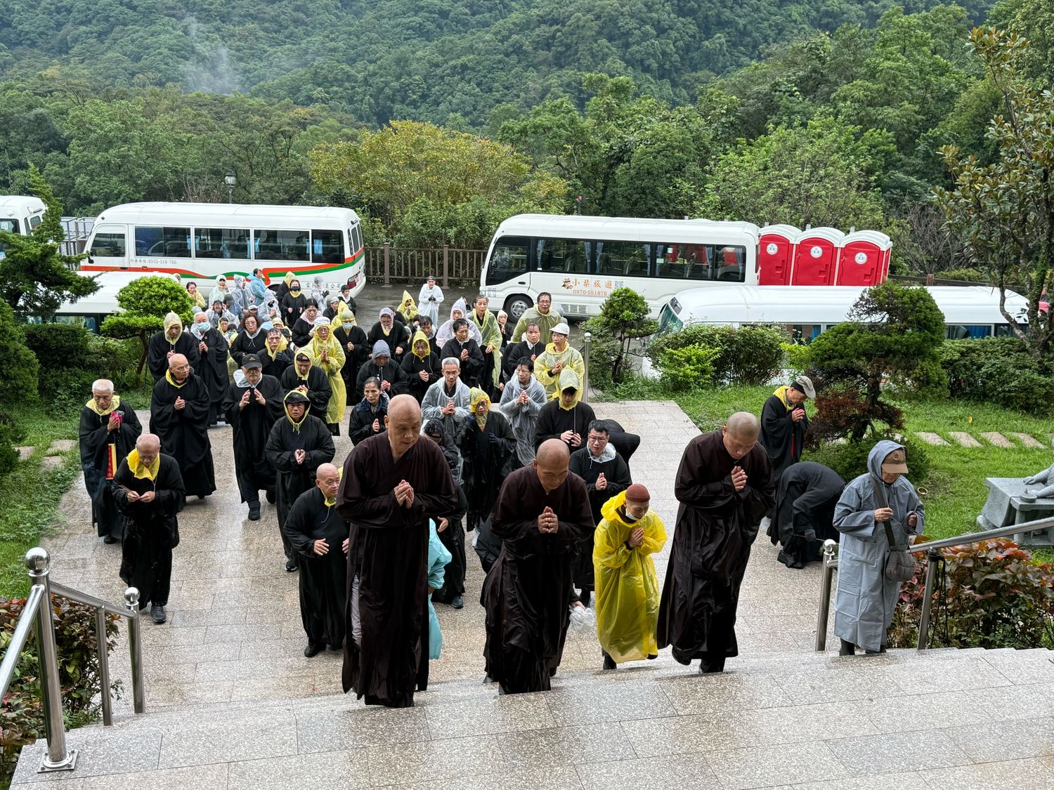 清晨,細雨如絲,輕輕灑落在雙溪小築的山徑上。台北靈巖山寺雙溪小築第八屆百七護國息災法會剛剛圓滿,然而修行的腳步並未止息。翌日,四眾弟子齊聚山腳,無懼風雨,整齊列隊,準備朝山禮佛。