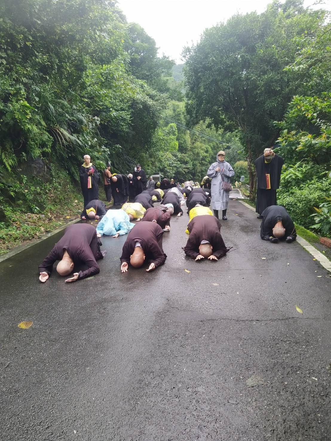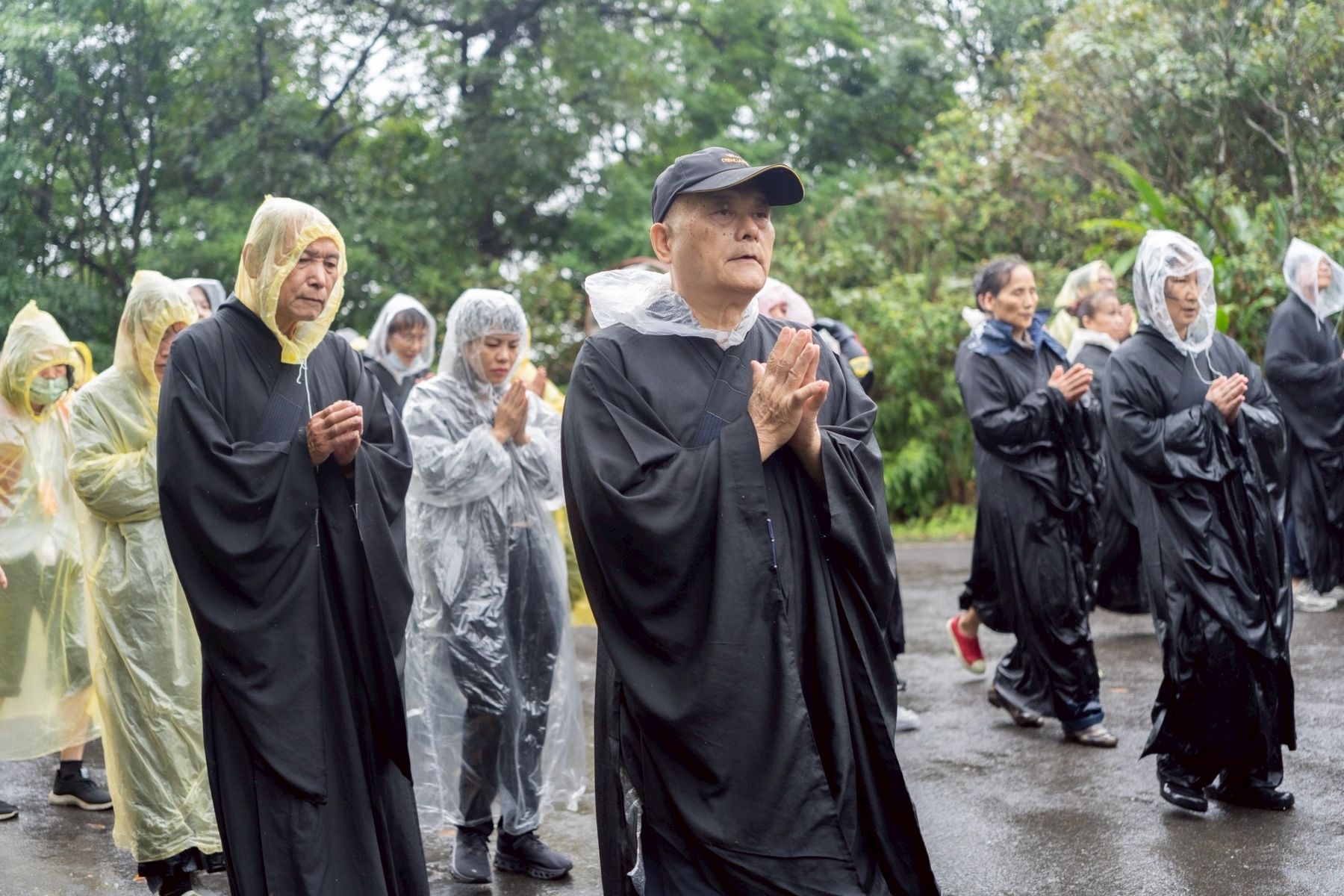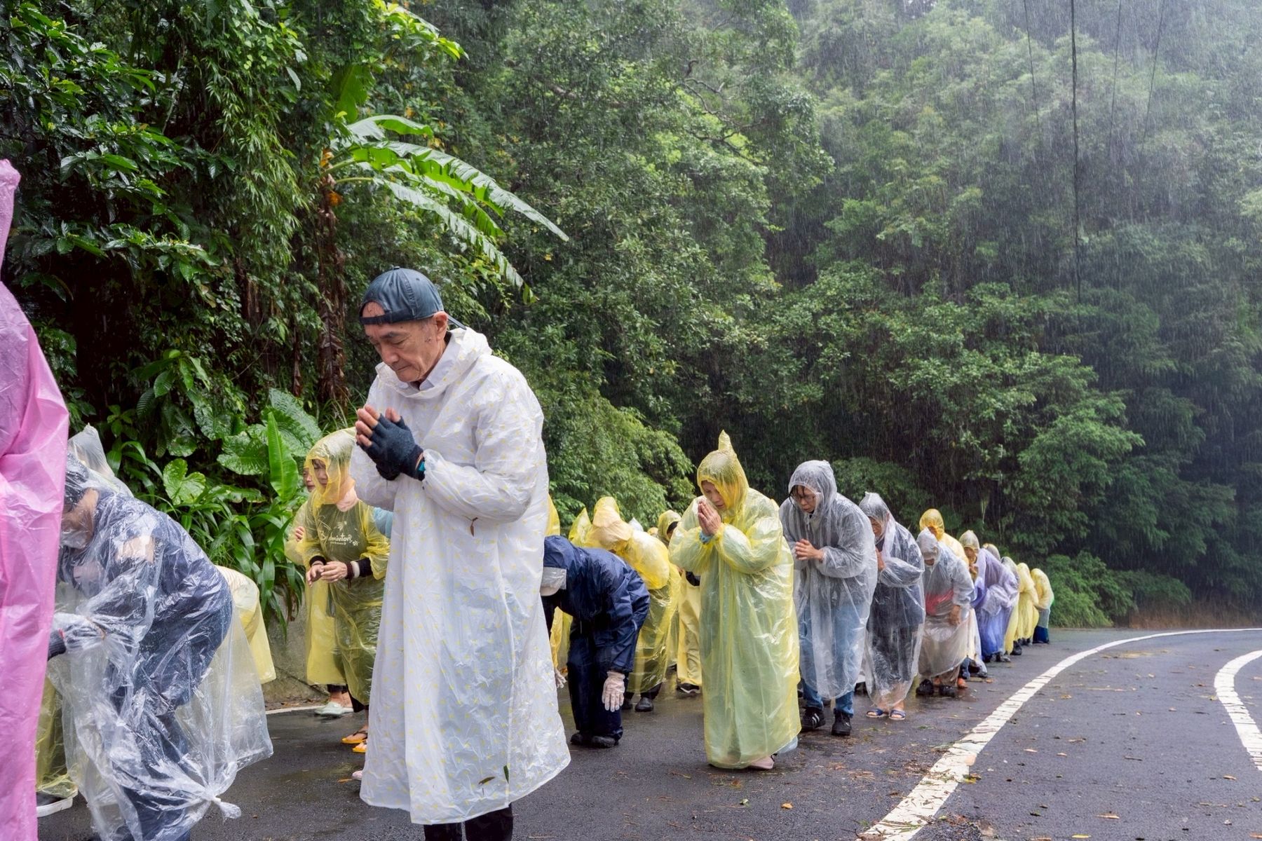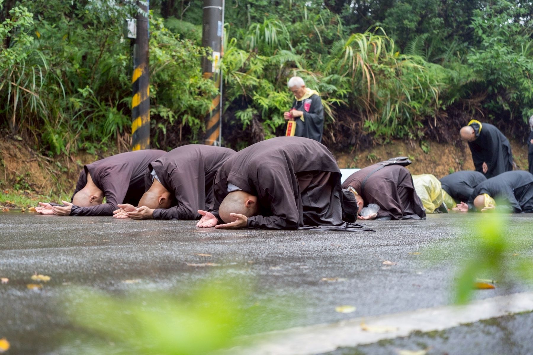 雨絲輕拂面頰,彷彿是佛菩薩的慈悲灑淨。大眾三步一拜,隨著阿彌陀佛的聖號,身體伏地,心也一點一滴的沉澱下來。每一次的俯身,都是一次放下;每一次的起身,都是一次昇華。這不僅是身體的行動,更是淨化心靈的修行。