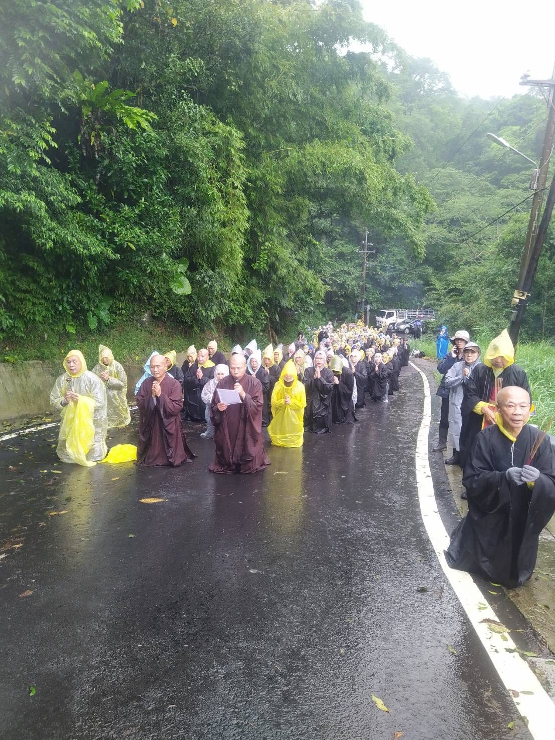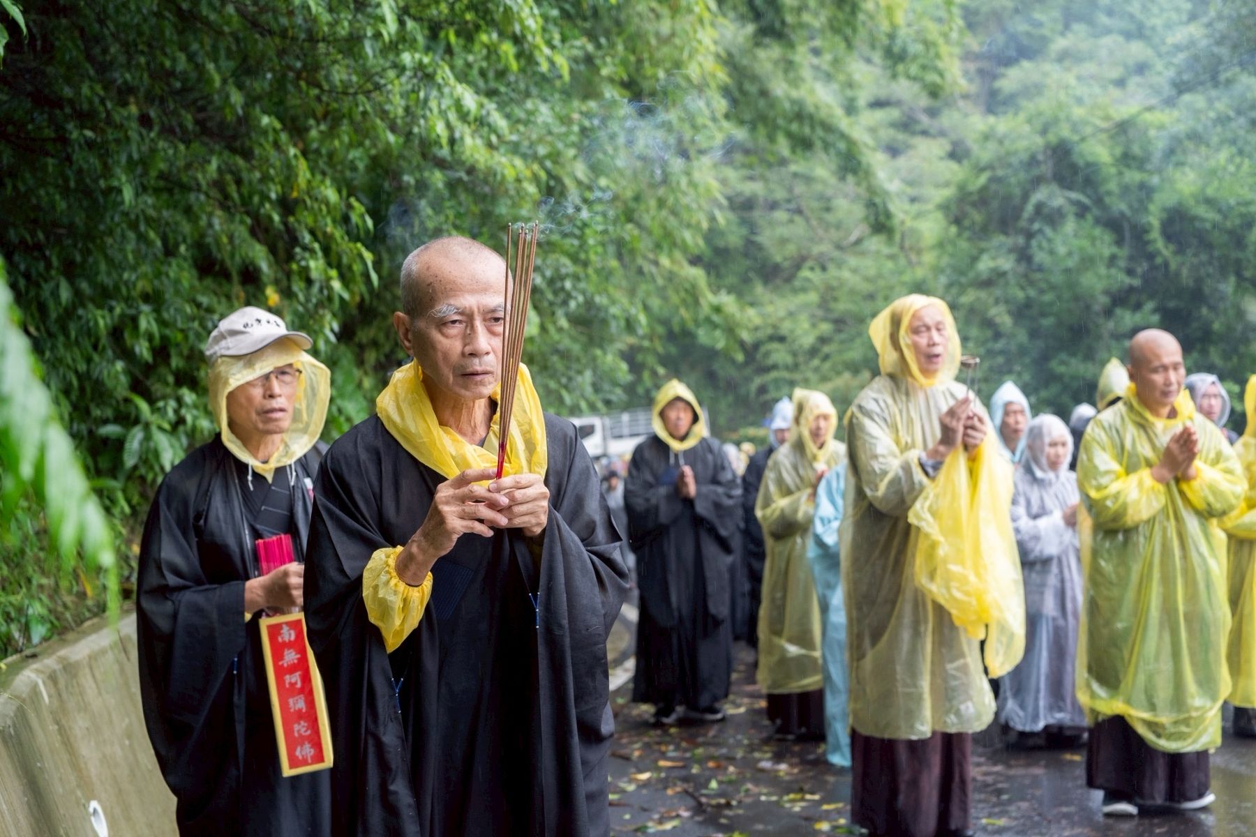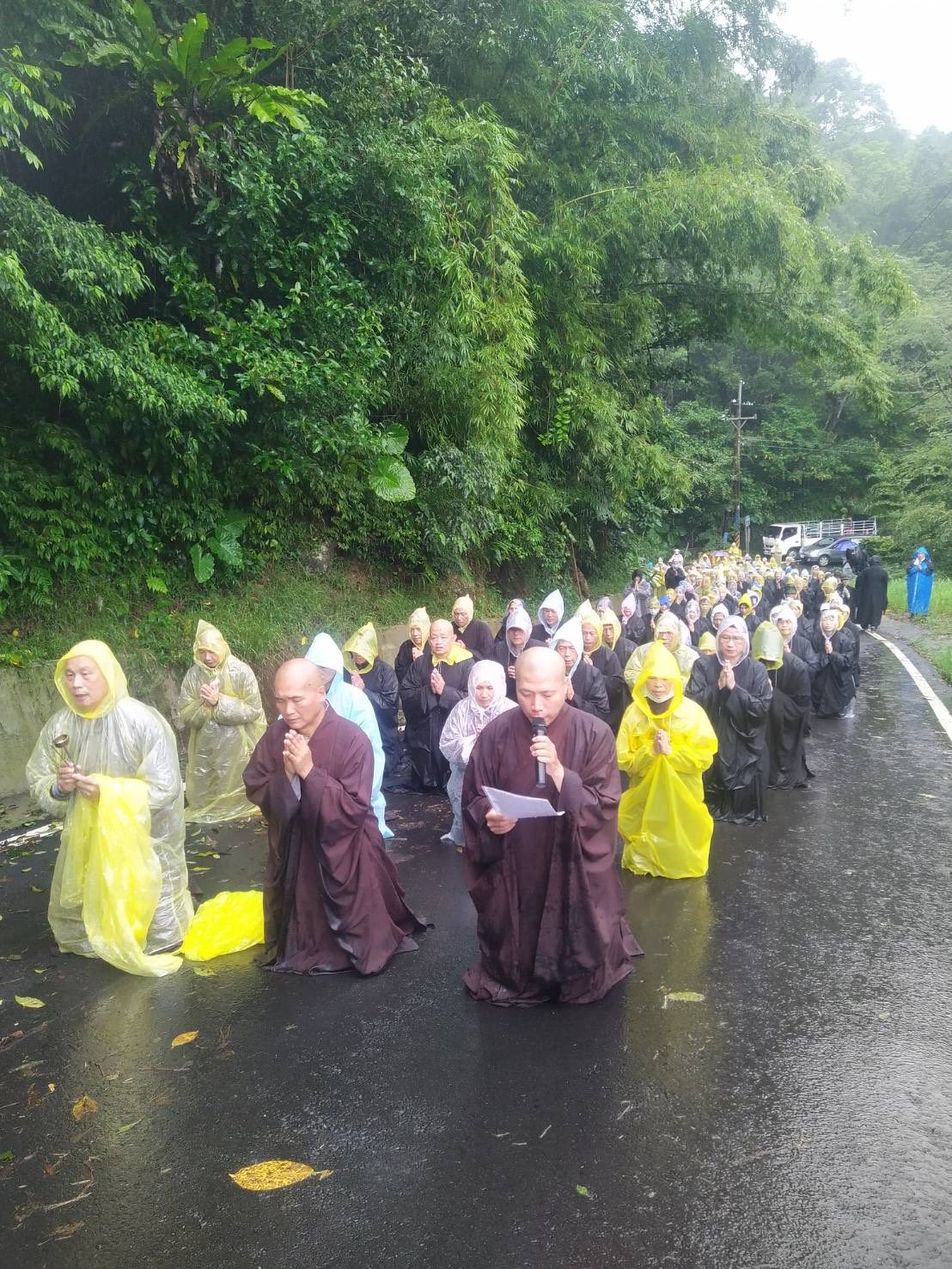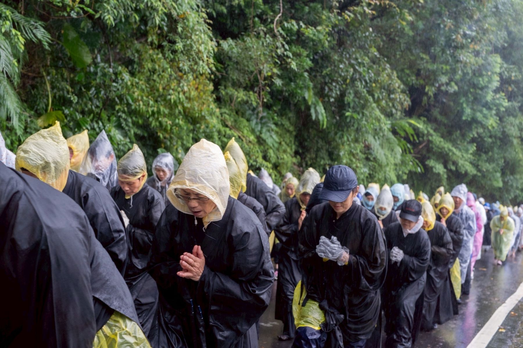 雨絲輕拂面頰,彷彿是佛菩薩的慈悲灑淨。大眾三步一拜,隨著阿彌陀佛的聖號,身體伏地,心也一點一滴的沉澱下來。每一次的俯身,都是一次放下;每一次的起身,都是一次昇華。這不僅是身體的行動,更是淨化心靈的修行。