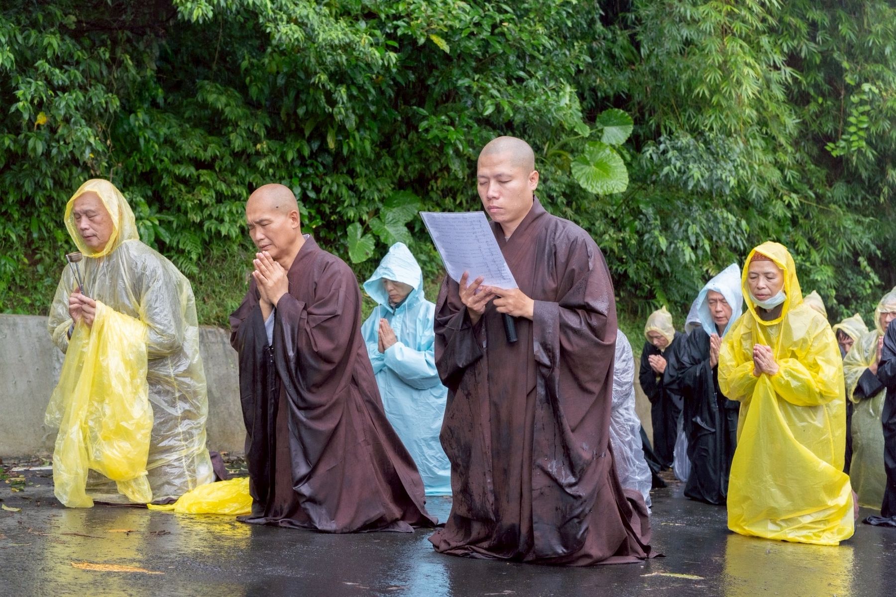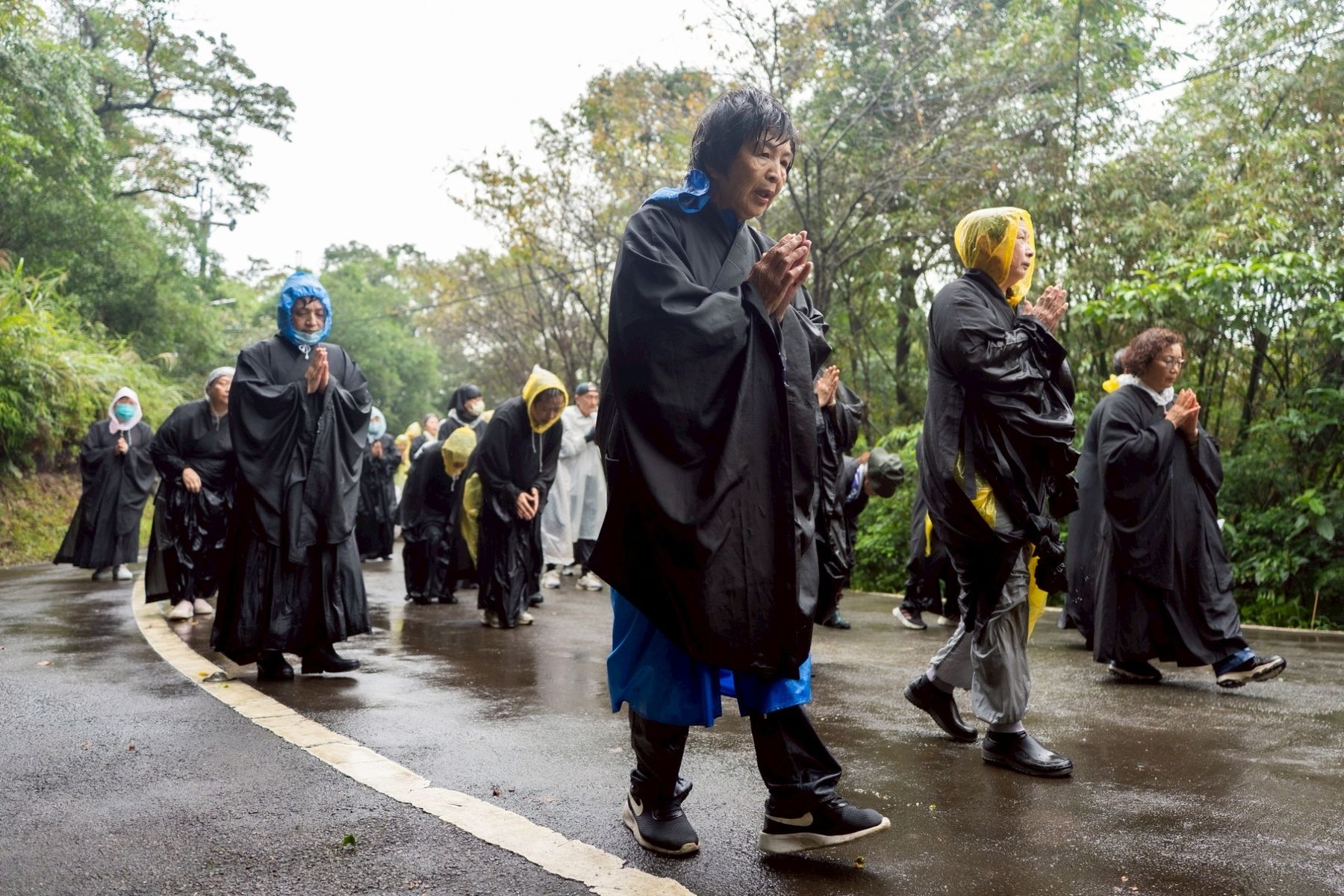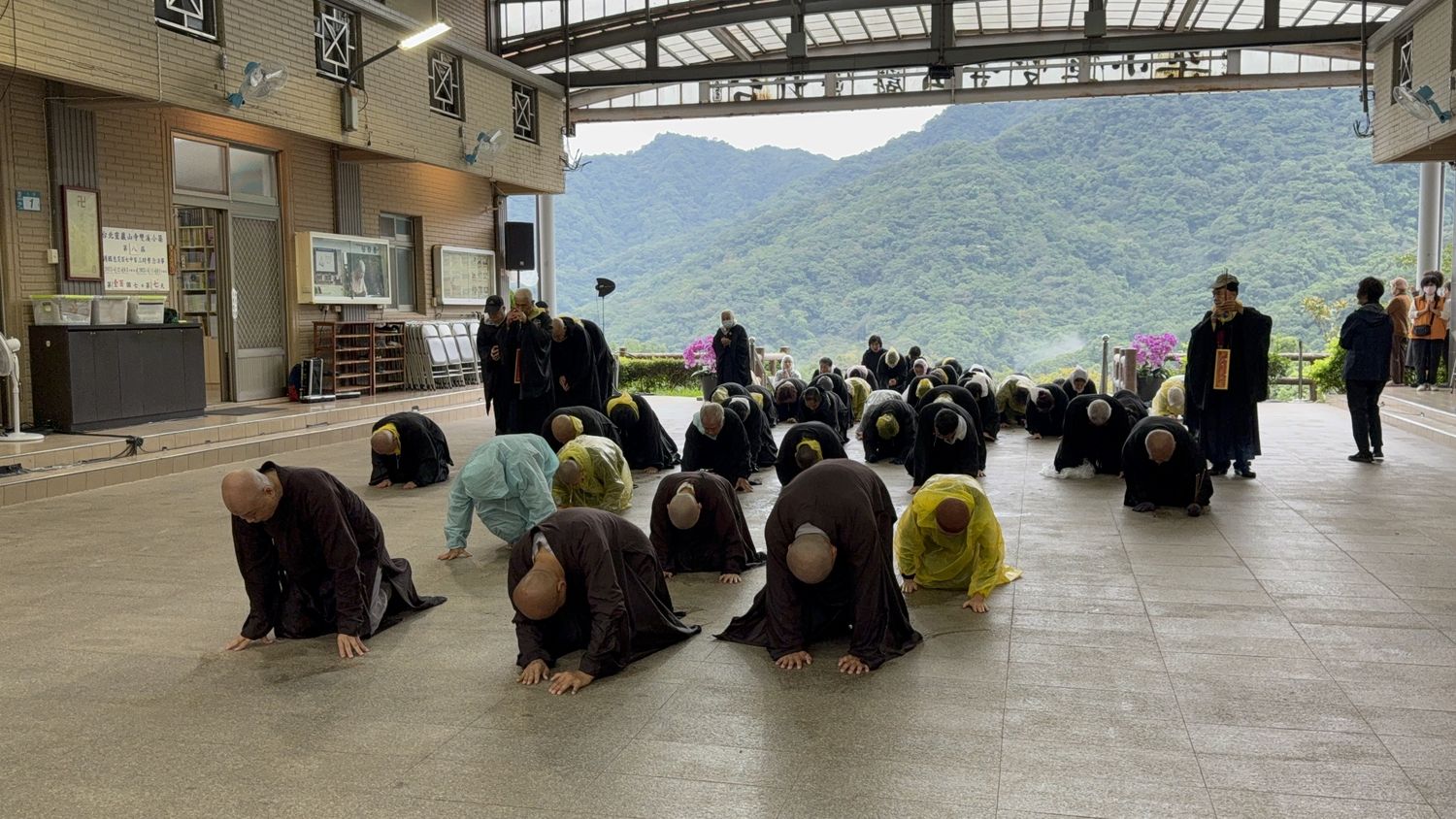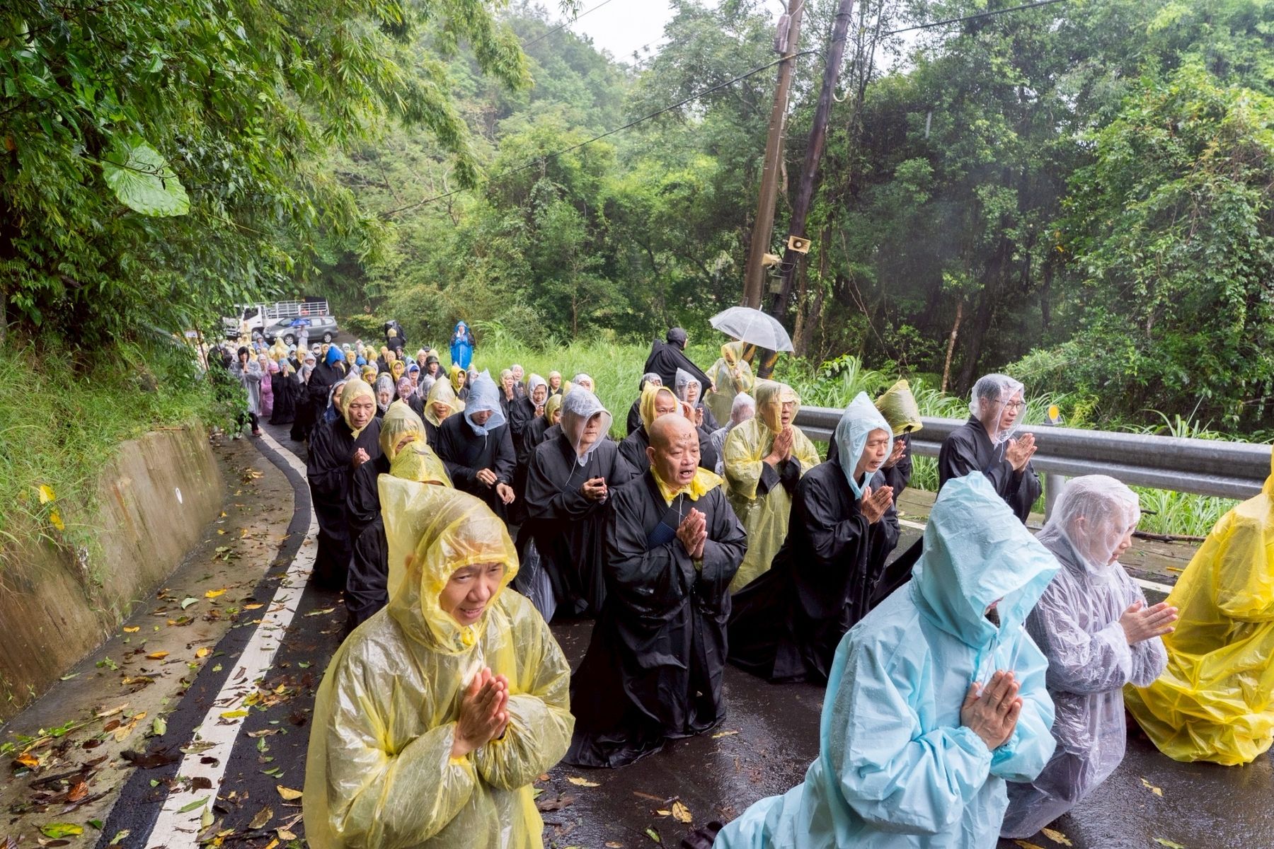 雨絲輕拂面頰,彷彿是佛菩薩的慈悲灑淨。大眾三步一拜,隨著阿彌陀佛的聖號,身體伏地,心也一點一滴的沉澱下來。每一次的俯身,都是一次放下;每一次的起身,都是一次昇華。這不僅是身體的行動,更是淨化心靈的修行。